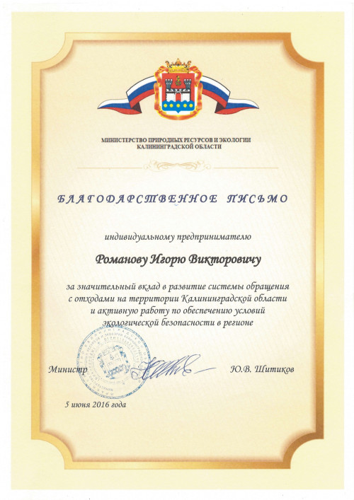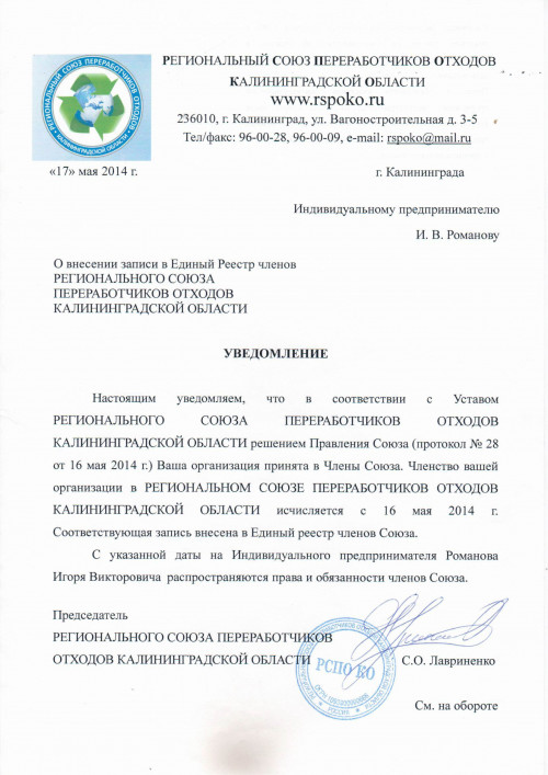 Член Союза РЕГИОНАЛЬНЫЙ СОЮЗ ПЕРЕРАБОТЧИКОВ ОТХОДОВ КАЛИНИНГРАДСКОЙ ОБЛАСТИ с 16 мая 2014 г.